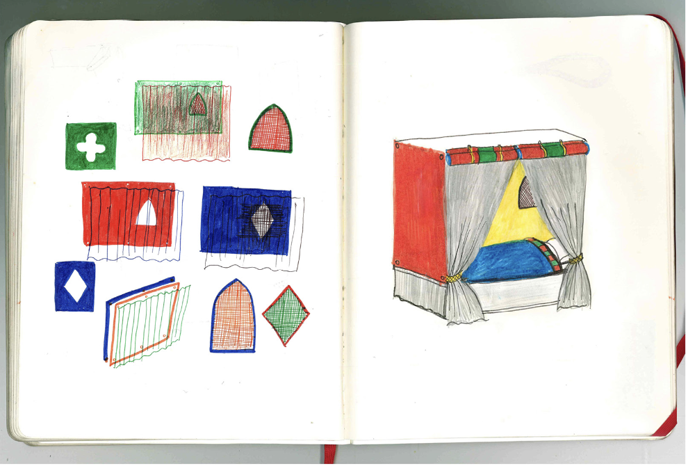 L’habillage textile du lit répond au caractère saisonnier du lieu. A l’intersection du mobilier textile et de l’habitat minimaliste, cette ré-interprétation du lit à baldaquin assure confort et intimité. Les parois textiles sont amovibles et se superposent tout en restant indépendantes les unes des autres. Un premier rideau est fabriqué à partir de chutes de bâches industrielles, telle une coque protectrice utilisée comme parure extérieure. Ses couleurs et ses formes évoquent tentures et drapeaux d’une époque lointaine, un anachronique Moyen-Âge.