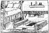 L’habillage textile du lit répond au caractère saisonnier du lieu. A l’intersection du mobilier textile et de l’habitat minimaliste, cette ré-interprétation du lit à baldaquin assure confort et intimité. Les parois textiles sont amovibles et se superposent tout en restant indépendantes les unes des autres. Un premier rideau est fabriqué à partir de chutes de bâches industrielles, telle une coque protectrice utilisée comme parure extérieure. Ses couleurs et ses formes évoquent tentures et drapeaux d’une époque lointaine, un anachronique Moyen-Âge.