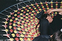Le projet détourne une structure usagée de trampoline pour la déplacer du jardin domestique vers l’espace intérieur. Collectée chez les particuliers, la carcasse du trampoline est réinvestie dans une forme capable de circuler entre l’intimité du foyer et des contextes plus collectifs.